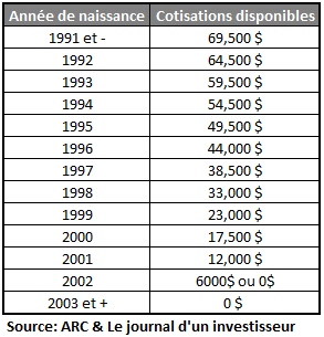 Votre montant de cotisation non utilisé est disponible dans votre dossier en ligne de l’Agence du Revenu du Canada (ARC) ou vous pouvez les appeler pour le savoir. Voici les cotisations accumulées pour 2020: