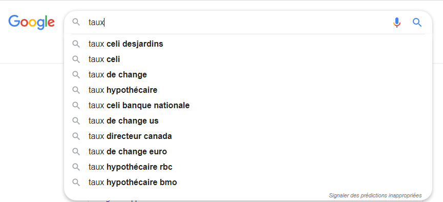 Bref, le CÉLI est l’endroit parfait pour des actions, il serait triste de l’utiliser en y mettant un compte épargne…dommage qu’il s’agisse de l’utilisation #1 du CÉLI au Canada (source). Vous êtes sceptique sur les résultats de sondage? C’est correct, je le suis souvent aussi, voici la page de recherche de Google pour le mot « taux »: