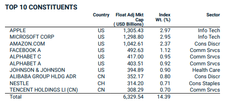 On ne parlera pas des États-Unis dont 5 entreprises font plus de 20% du S&P500… Il s’agit des 5 premières entreprises de ce tableau.