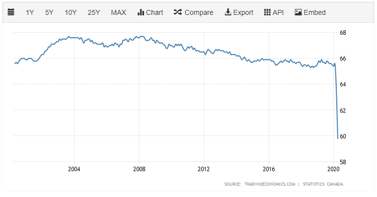 Les perspectives du marché de l’emploi n’ont pas changé à moyen terme. Le marché de l’emploi était serré avant la crise et avec raison. Le vieillissement de la population soutient un marché de l’emploi fort. Le taux d’activité (participation rate) équivaut aux individus avec un emploi divisé par la population en âge de travailler. On voit dans le graphique que ce taux est en constante diminution depuis 2008. Il y a probablement beaucoup de personnes âgées qui ont arrêté de travailler. Si on se base uniquement sur ce graphique, le marché de l’emploi devrait retrouver une bonne vigueur plus ou moins rapidement. La dernière donnée est affectée par la pandémie comme on peut le voir. J’ai ajouté un second graphique, la pyramide des âges, pour soutenir mon point. Je montre les données du marché canadien, mais les marchés développés sont généralement dans la même situation.