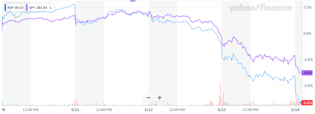 En lien avec mon dernier article, voici la différence de rendement pour cette semaine entre le SPY et RSP. Le S&P 500 a perdu 3.8%, mais le S&P 500 equal weight en a perdu beaucoup plus avec une chute de 6.6%. Un indice equal weight implique que toutes les entreprises dans l’indice représentent le même poids contrairement aux indices market weighted traditionnels où les grosses firmes ont une place beaucoup plus importante.