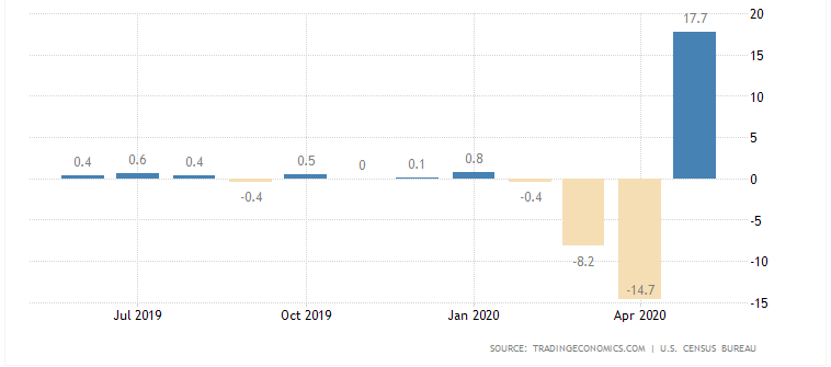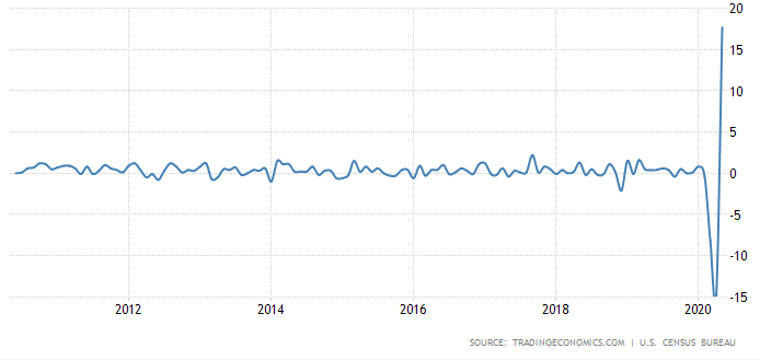 Les ventes au détail ont été en croissance de 17.7% sur le mois, la plus forte hausse jamais enregistrée depuis la collecte des données (1992). Le rebond des ventes au détail a été beaucoup plus fort qu’anticipé. Les investisseurs envisageaient une hausse de 8%, mais la reprise a été plus du double. Les consommateurs américains semblent presser de dépenser l’argent qu’ils ont accumulé pendant le confinement.