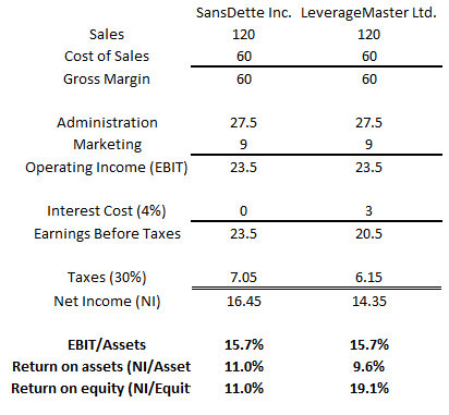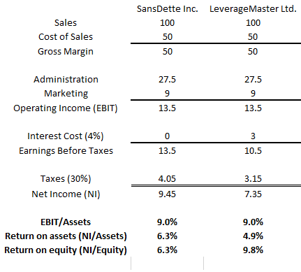 Voici une petite illustration de deux entreprises identiques, mais dont l’une a de la dette. SansDette Inc. a des actifs (assets) de 150M$ et aucune dette alors que LeverageMaster Ltd. est financé par 75M$ de dette et 75M$ d’équité pour le même montant d’actifs de 150M$. Voici l’état des résultats (income statement) des deux entreprises: