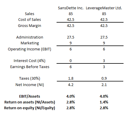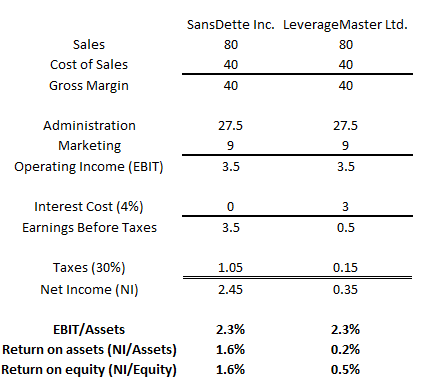 Sur le plan operationnel, les 2 entreprises sont identiques, ils ont le même EBIT/Assets. L’entreprise LeverageMaster Ltd. semble bien moins profitable quand on regarde son profit (NI) ou son return on assets (rendements sur les actifs). En réalité, les actionnaires de l’entreprise LeverageMaster Ltd. touchent un rendement plus élevé que l’entreprise sans dette, car le return on equity (rendement sur l’équité) est plus élevé.