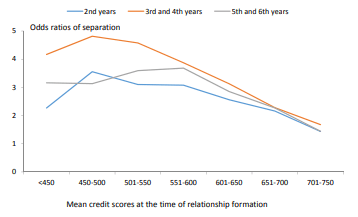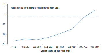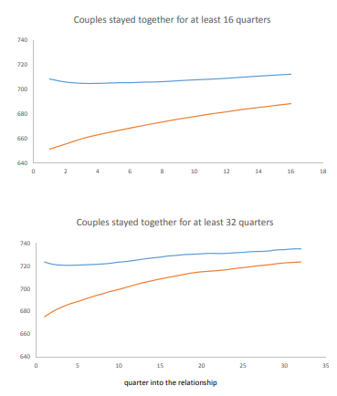 On parle d’engagements financiers, mais est-ce que cela pourrait s’appliquer aux engagements en général ou à l’engagement amoureux? C’est ce que semble dire un papier sur lequel je suis tombé, réalisé par des chercheurs à la banque centrale américaine. Le sujet traite des cotes de crédits et des relations à long terme (Credit Scores and Committed Relationships). Simplement en sélectionnant leurs graphiques, on est capable de raconter une belle histoire.