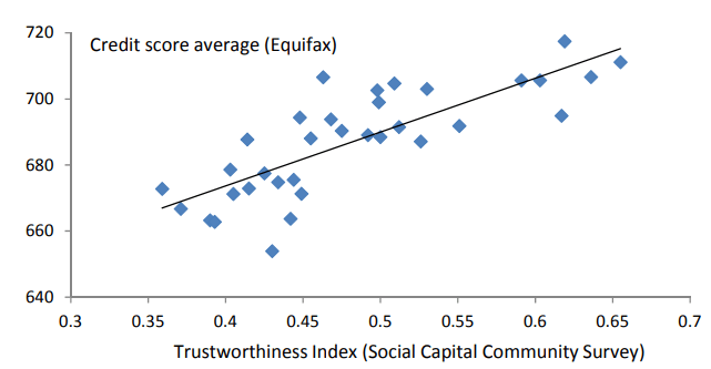 On remarque que lorsque la moyenne des cotes de crédit du couple est élevée, plus la probabilité de séparation est faible. L’article nous donne une piste très intéressante sur la raison du pourquoi. En plus des cotes de crédit, ils ont recueilli un sondage sur la confiance de l’individu envers les gens. Le type de question était du genre « peut-on faire confiance aux gens en général ? ». Le résultat est que les gens avec une cote de crédit plus faible ont tendance à faire moins confiance aux gens.