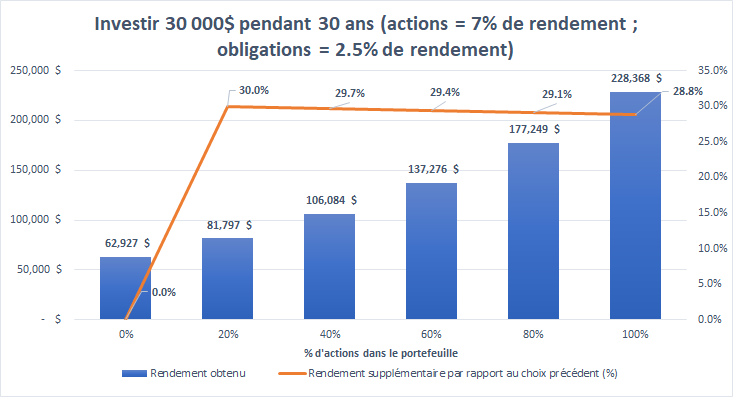 L’augmentation en pourcentage est légèrement plus faible au fur et à mesure qu’on augmente la pondération en actions, mais le résultat de notre investissement est de plus en plus gros. Par exemple, j’aime bien mieux gagner 25% de 1M$ (250K$) que de gagner 30% de 500K$ (150K$). C’est le même principe ici. Avec un portefeuille 80% actions j’aurais généré un résultat d’investissement élevé. Lui rajouter un gain de 28.8% a un impact significatif en dollar (51 119$ dans ce cas-ci).