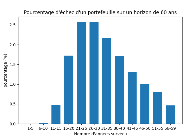 Le portefeuille aurait ainsi 2.21%, 4.78%, 7.36%, 9.53%, 11.24%, 12.55%, 13.56%, 14.36% et 14.82% de chance de ne pas passer au travers d’une période de 20, 25, 30, 35, 40, 45, 50, 55 et 60 ans. Dit autrement, notre retraité a ce pourcentage de chance de manquer d’argent pour sa retraite pour l’horizon choisi. On rappelle que le taux d’échec sur 30 ans de la Trinity Study originale basée sur les données historiques du marché américain était de 0%. Pour l’étude revisité, un portefeuille 100% actions avait un taux d’échec de 6% sur 30 ans. Je suis assez près de ce résultat en obtenant 7.36% avec ma simulation.