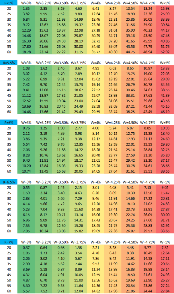 -Un taux de retrait de 3% est souvent jugé comme trop conservateur. C’est en effet conservateur si on anticipe que le marché boursier réalisera le rendement boursier historique (R=7%). Si on s’attend à un rendement réel dans le bas de la fourchette des estimations (5-6%), un taux de retrait de 3% n’est plus aussi conservateur qu’on pourrait le croire.