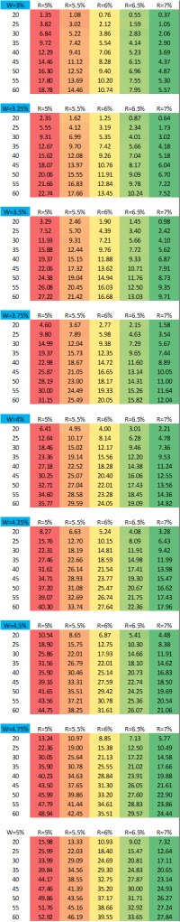 –W: le retrait (withdrawal) du portefeuille chaque année. Il est exprimé en pourcentage. Un portefeuille de 1M$ avec un retrait annuel de 40K$ aurait un retrait en pourcentage de 4% (W=4%). Comme j’utilise le rendement réel, les retraits augmentent au rythme de l’inflation de façon implicite.