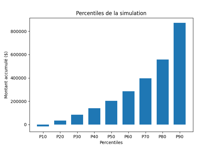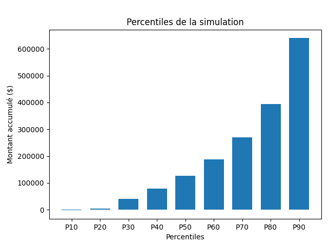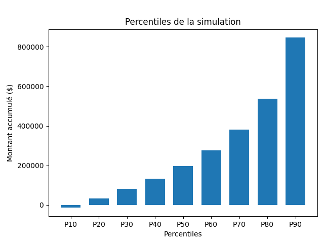 - Hypothèque : L’investisseur investit 100K$ et rembourse le capital et les intérêts sur 25 ans grâce aux rendements boursiers. Si l’investisseur est en défaut de paiement, c’est-à-dire que ses investissements sont trop faibles pour rembourser le capital et les intérêts, la simulation s’arrête. L’investisseur réalise une perte à la hauteur du montant qu’il ne peut pas rembourser.