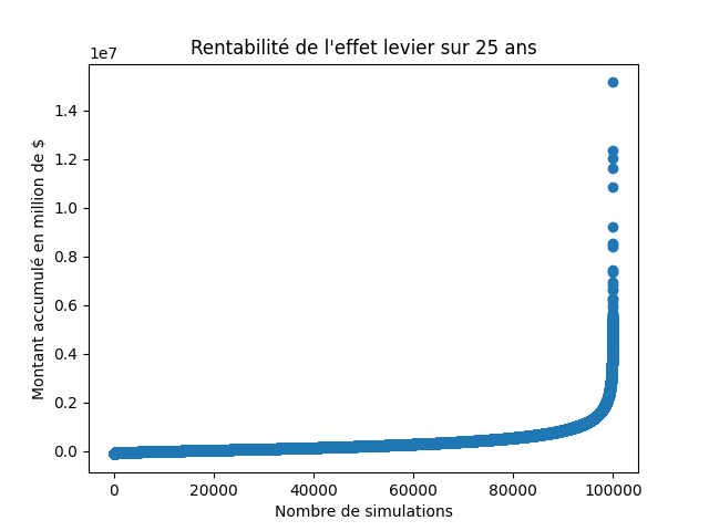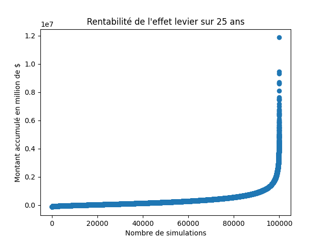-Sur 100K simulations, autant pour la marge de crédit que pour l’hypothèque avec réendettement, moins de 20% des cas obtiennent un rendement négatif sur 25 ans. Le levier financier est risqué, mais sur de long horizon ce n’est pas si mal. C’est plutôt le court terme qui est difficile à gérer.