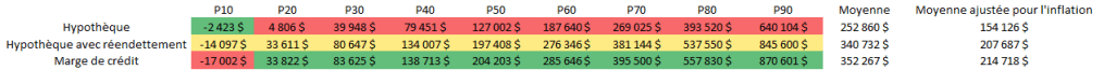 -L’hypothèque est de loin la méthode la moins efficace en termes de $. Par contre, c’est cette méthode qui minime les pertes extrêmes comme on a l’équivalent d’un « stop-loss » intégré. On rappelle que dans ce scénario du moment qu’on ne peut plus rembourser, on arrête la simulation. On utilise aussi beaucoup moins de levier que les 2 autres méthodes ce qui pousse à avoir un montant absolu plus faible sur de longs horizons, mais aussi un risque de perte plus faible.