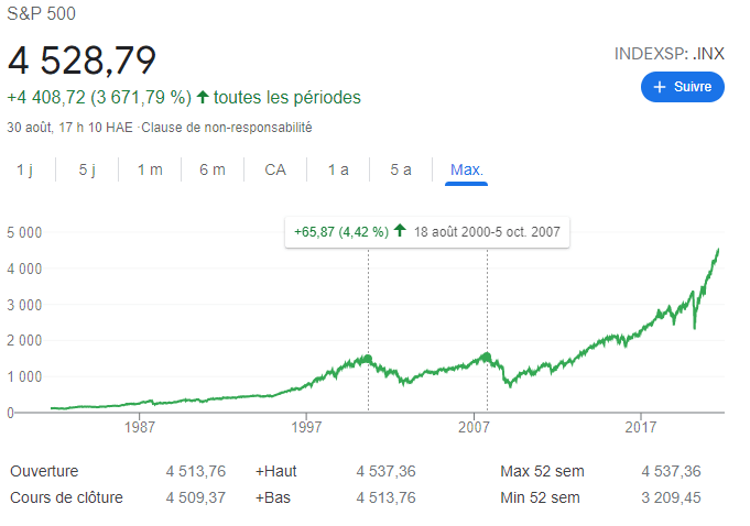 Le S&P 500, de son côté, a pris 7 ans pour dépasser son sommet historique par peu. Il faudra 12 ans pour que celui-ci dépasse son sommet historique de façon plus convaincante.