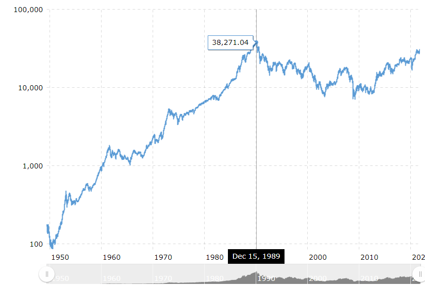 L’indice japonais Nikkei 225 a connu une croissance démesurée dans les années 70 à 90… avant de baisser et stagner pendant plus de 30 ans.