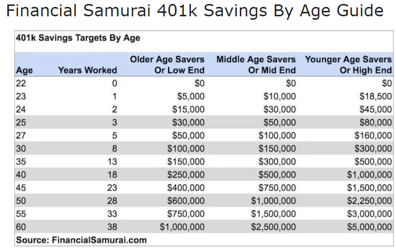 Dans le même sens, je ne crois pas aux règles qui donnent un objectif de valeur nette à un âge donné. Elles sont très arbitraires. Par exemple, voici l’objectif que quelqu’un devrait obtenir selon Financial Samurai, un blogueur américain. Il a travaillé comme banquier d’affaires (investment banker) engendrant des salaires importants au courant de sa vie. Il vit à San Francisco en Californie, un endroit où le coût de la vie est extrêmement élevé.