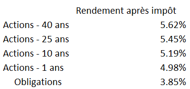 Avec les hypothèses précédentes, le rendement après impôt des obligations sera toujours de 3.85%. Par contre, le rendement après impôts des actions va changer dépendamment de l’horizon qu’on peut différer l’impôt du gain en capital. Plus on reporte longtemps, plus le rendement va tendre vers 6.1% qui est le rendement après le paiements de l’impôt sur les dividendes.