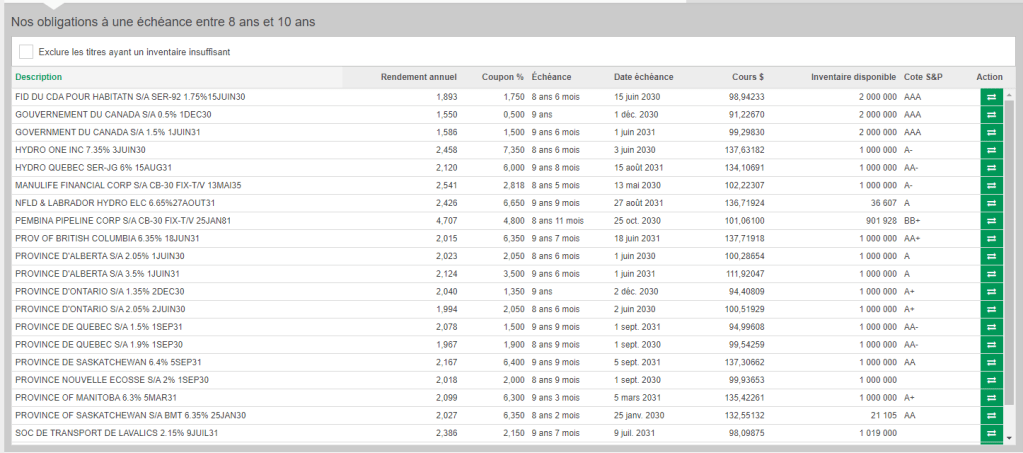 Voici ce qui sort de mon compte de courtage si je regarde pour des obligations individuelles. Eh oui, si vous ne le saviez pas, vous pouvez acheter des obligations individuelles tout comme des actions individuelles. Par contre, les montants exigés sont plus élevés. Par exemple, chez mon courtier à escompte (Disnat), il faut au minimum 5K$ pour investir dans une obligation individuelle. Les obligations sont moins liquides que les actions, car elles sont toutes différentes même si elles se ressemblent toutes au final. Ainsi, votre courtier à escompte possède un inventaire d’obligations qu’il est prêt à vous vendre ou à acheter. Alors que les actions se transigent de façon très dynamique, les obligations se transigent principalement avec votre courtier.