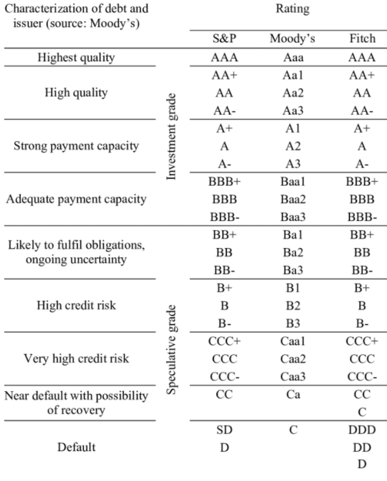 Cote Standard & Poor’s (S&P): un indicateur de risque. Il y a plus d’une agence de cotation de crédit. Plus bas, je mets un résumé des différentes agences. On va qualifier les obligations avec une cote S&P supérieur ou égale à BBB- de « investment grade » (obligations de bonne qualité) et inférieure à BBB- (implicitement BB+ et moins) de high yield ou des obligations « non-investment grade/high yield » (obligations spéculatives / obligations de qualité inférieure / obligations de moins bonne qualité). Pour les obligations avec une qualité très faibles (B-, CCC, etc.), on peut parler de « junk bonds » (obligations de pacotille / obligations hautement spéculatives).
