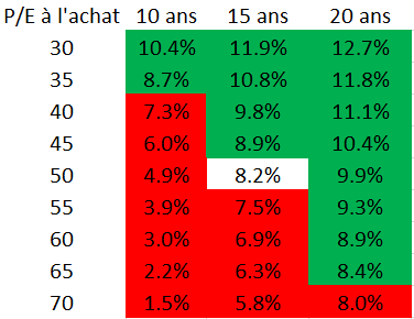 Je fais varier le P/E initial de The Growing Company et sa période de croissance extraordinaire dans le tableau ci-dessous.