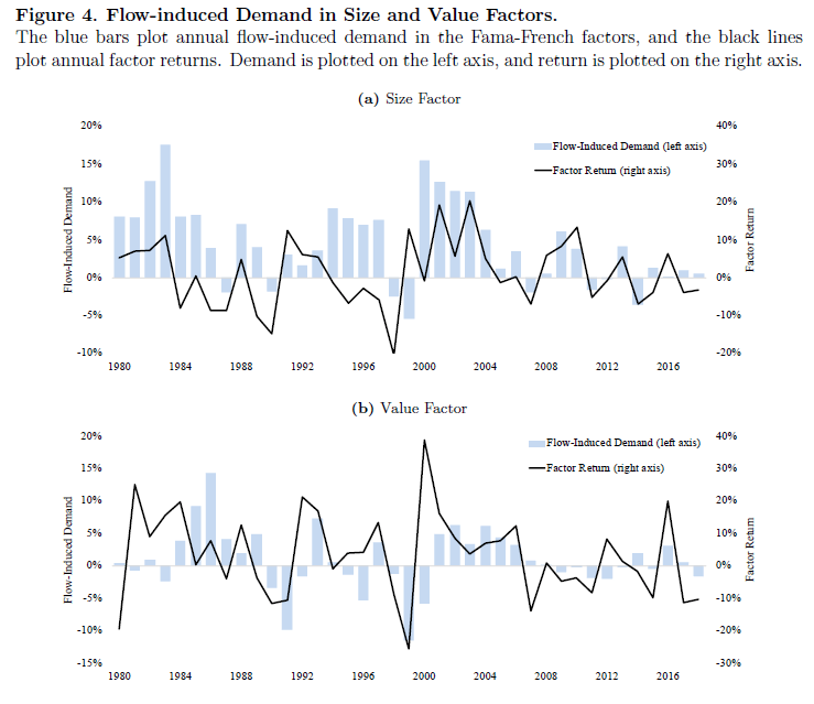 J’ai trouvé un papier intéressant (What Drives the Size and Value Factor) qui tente de trouver une réponse à cette question. L’auteur, qui est assistant professeur à l’Université de l’Utah et doctorant de l’Université de Stanford, analyse l’impact des flux des fonds mutuels et le rendement des facteurs. Il constate qu’il y a une corrélation entre les flux monétaires et le rendement réalisé. Quand des flux entrent dans un fonds, cela va avoir tendance à générer un rendement positif pour le facteur, mais cette tendance tend à se renverser par la suite.