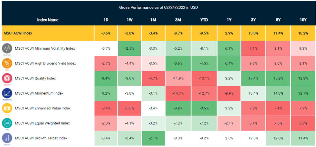 Quand on y réfléchit, les grosses sociétés technologiques (large cap growth) ont bien fait dans les dernières années. Ainsi, les investisseurs ont potentiellement été attiré vers ces types de fonds pour répliquer les rendements du passé. Cet afflux d’argent dans les fonds « large and growth » ont probablement eu une pression sur les prix en bourse. On ne le voit pas sur les graphiques, mais les années qui ont survi 2017 ont très certainement été en faveur du « large and growth » comme le montrait la performance du tableau de MSCI.