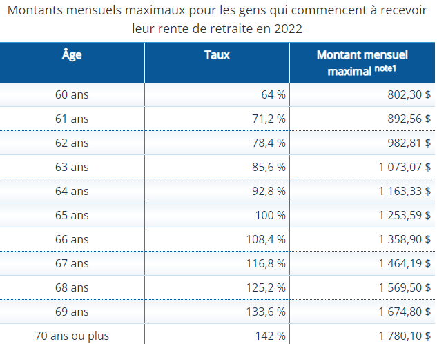 Il faut savoir que le gouvernement canadien verse un montant de 642.25$ par mois (2022) si vous avez 65 ans et plus pouvant être reporté et bonifié. Un gros élément à considérer est si vous avez une rente du Régime des rentes du Québec (RRQ) et/ou une rente privée fournie par votre employeur. Si vous avez travaillé toute votre vie, vous ayez normalement droit à la RRQ. La rente change en fonction des cotisations que vous avez payé au courant de votre vie.