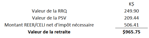 Comme j’utilise un taux d’actualisation de 0% (rente garantie ajustée à l’inflation), on peut simplement additionner les sommes. Par exemple, pour la RRQ, 8400$ par année * 35 ans * (1-15%) = 249.9K$. Le 15% représente le taux d’imposition anticipé sur les sommes. La RRQ et la PSV sont imposables, donc on doit y enlever l’impôt.