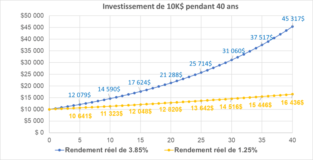 Après frais, le portefeuille génère 3.25%. Vous pensez que c’est faible? Vous n’avez pas soustrait l’inflation encore. On soustrait un autre 2% pour obtenir un gain réel de 1.25%.