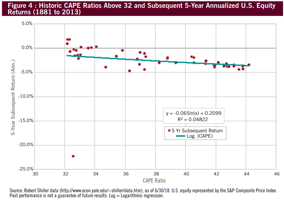 Par contre, si vous êtes situés aux extrêmes, le CAPE a un impact significatif sur le résultat. Prenons le tableau suivant qui montre tous les CAPE plus haut que 32 entre 1881 et 2013. Selon la régression, un CAPE de 36 prédit un rendement annualisé sur 5 ans de -2.3%. Oupsi.