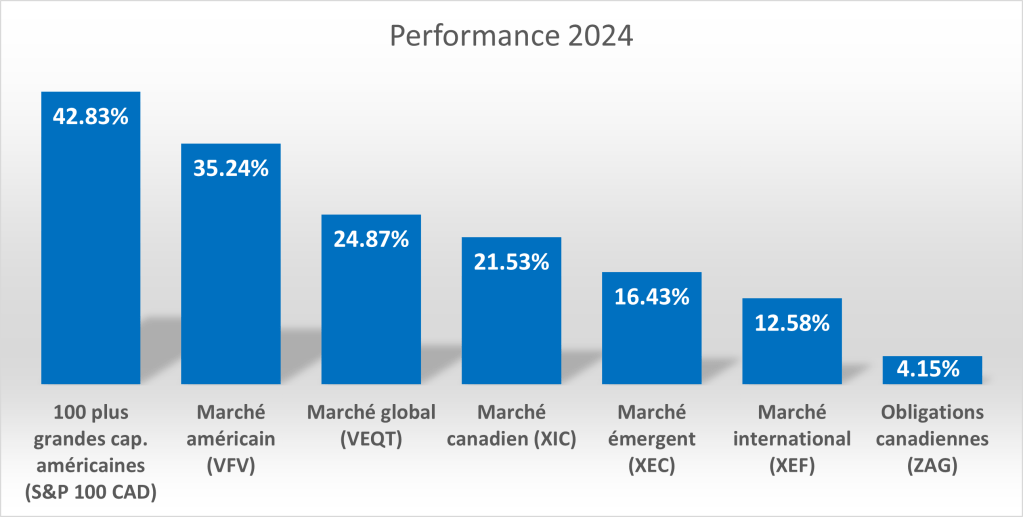 Voici le rendement de différents marchés. Les performances sont tous en CAD. Les FNB sous-jacents sont entre parenthèse à l’exception du S&P 100 CAD qui est un indice et non un FNB: