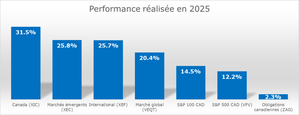 Nous avons été choyiez dans les trois dernières années. La performance VEQT, soit le marché global, a été de 20.7% sur 3 ans. (2023: 17%, 2024: 24.9%, 2025: 20.4%). Lorsque les marchés mondiaux montent énormément, il y a forcément des segments qui deviennent explosifs sous l’excitation des investisseurs. Il ne faudrait pas trop s’y habituer ni être complaisant.
