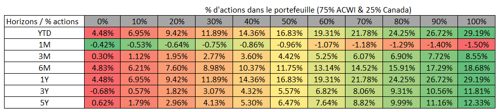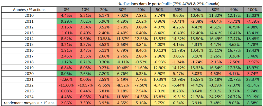 – J’utilise une version avec davantage d’actions canadiennes que l’indice mondial, car les investisseurs ont tendance à surpondérer leur pays d’origine. Dans ce scénario, j’utilise 25% de FNB XIC et 75% de FNB ACWI pour les actions, car j’estime que les gens ont en moyenne 25-30% en action canadienne. Le FNB ACWI contient environ 3% d’investissement au Canada.