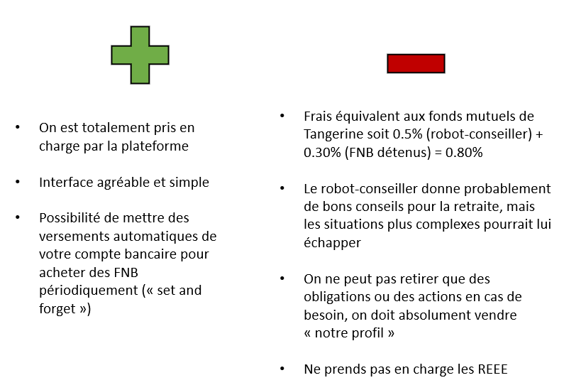 Tangerine a sorti des nouveaux fonds mutuels constitués de fonds négociés en bourse (FNB) sous le nom « Portefeuilles FNB mondiaux Tangerine ». Les frais sont un peu plus faible à environ 0.75%. Ceux-ci ont une exposition très faible en actions canadiennes (3% pour le 100% action) et se basse davantage sur un indice mondial. La portion obligataire est similaire à l’autre produit: 100% dans des obligations canadiennes ce qui est assez standard.