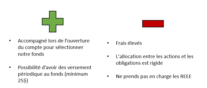 Sinon, votre institution financière où vous avez votre compte chèque peut faire l’affaire, cela évite 2 jours d’attente pour le transfert des fonds. Attention aux différents types de frais par contre. Pour les 30 voire 35 ans et moins, il y a souvent des programmes pour n’avoir aucun frais lié à la quantité d’actifs.