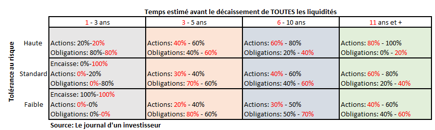 Le tableau donne deux allocations par rectangle. Par exemple, pour une tolérance au risque standard et un horizon de 6 à 10 ans :Pour un horizon de 10 ans, l’allocation devrait être de 60% d’actions et 40% d’obligations. À mesure que le temps passe et que l’horizon passe vers 6 ans, l’allocation devrait s’approcher de 40% en actions et 60% d’obligations.